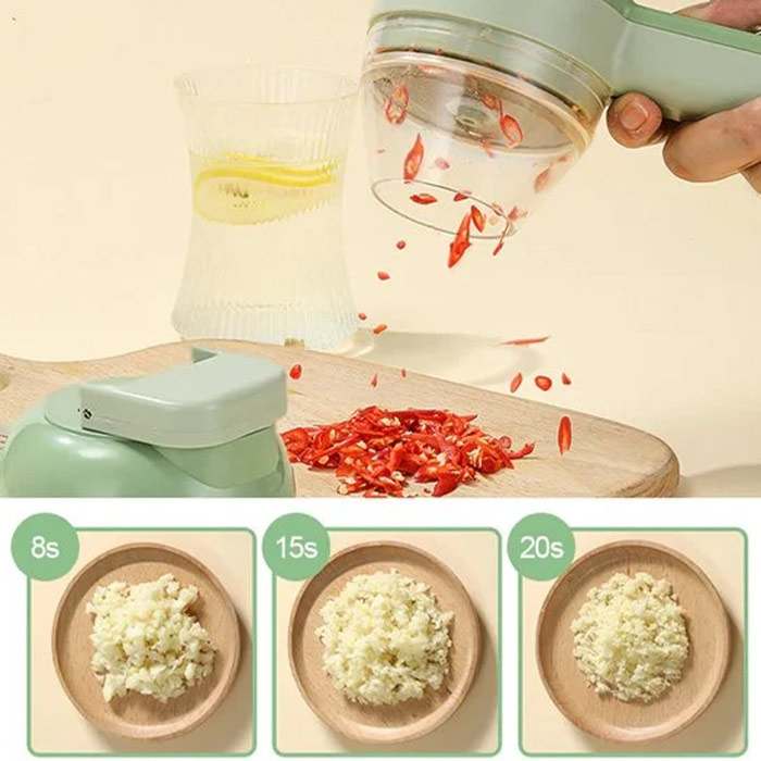 Najwyższy zestaw do łatwego cięcia i siekania jest prostszy i bardziej przystępny niż skomplikowane urządzenia kuchenne oraz mocniejszy i szybszy niż zwykłe noże kuchenne. Zestaw zawiera 2 różne pojemniki (jeden zamknięty i jeden z otworem), 2 ostre ostrza, elektryczną, akumulatorową rączkę, obieraczkę do owoców i trwałą elektryczną szczotkę do czyszczenia!